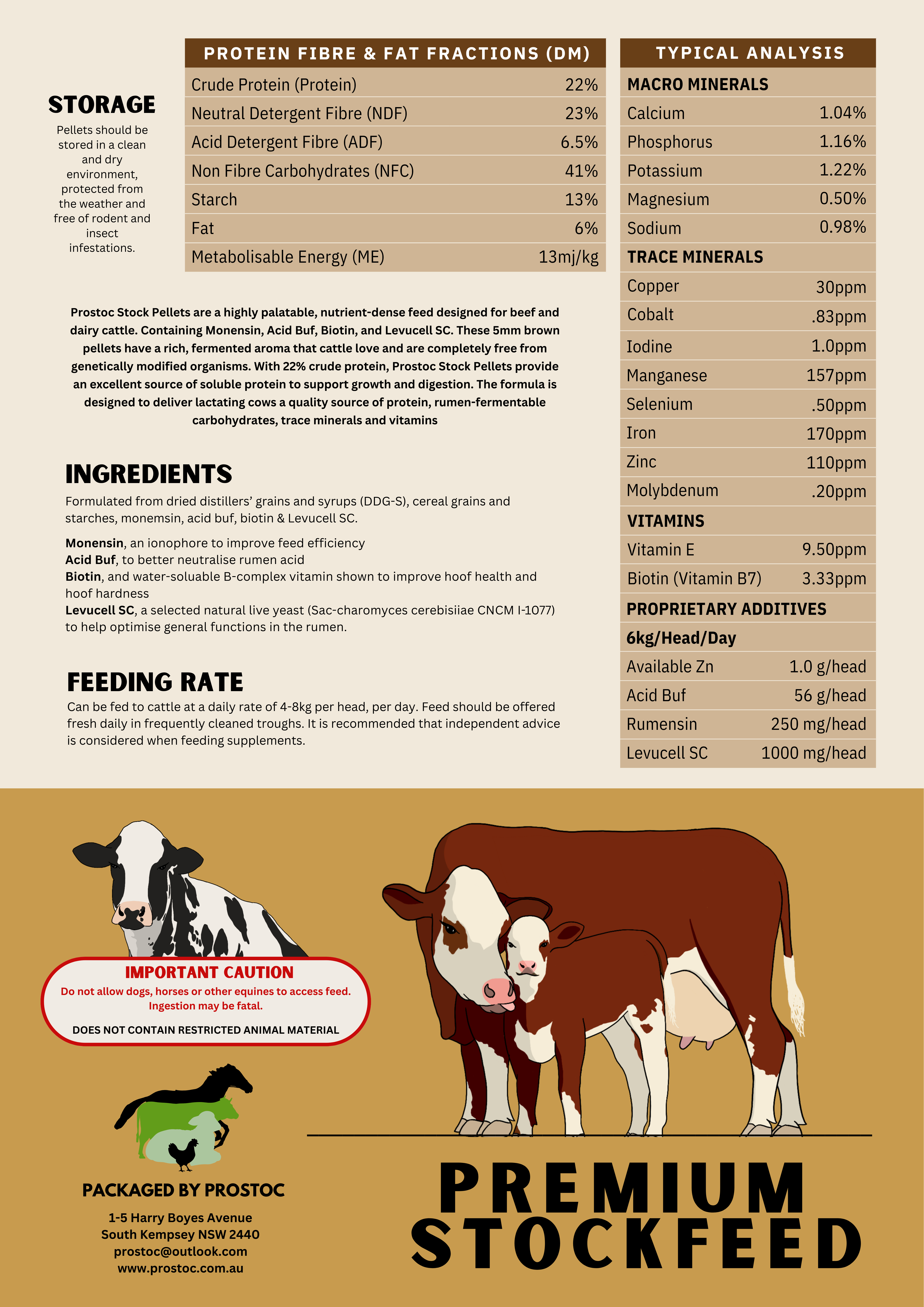 Prostoc Stock Pellets are a highly palatable, nutrient-dense feed designed for beef and dairy cattle. Containing Monensin, Acid Buf, Biotin, and Levucell SC, these 5mm brown pellets have a rich, fermented aroma that cattle love and are completely free from genetically modified organisms. With 22% crude protein, Prostoc Stock Pellets provide an excellent source of soluble protein to support growth and digestion. The formula is designed to deliver lactating cows a quality source of protein, rumen-fermentable carbohydrates, trace minerals and vitamins.